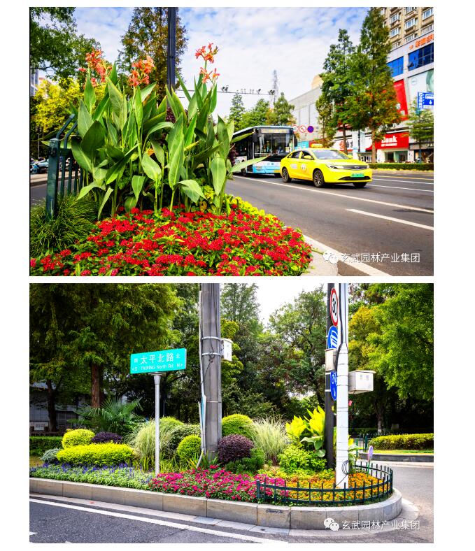 對北京東路、珠江路、市府門前路、太平北路、玄武大道、龍?bào)绰返染G島及島頭花境選用一品紅、萬壽菊、三角梅、洋鳳仙、麗格海棠、矮牽牛、歐月、藍(lán)雪花、超級(jí)海棠、翠蘆莉、一串紅、孔雀草、石竹等靚麗多彩、品相精致的花卉進(jìn)行布置,城市街景處處繁花似錦、百花齊放,營造栩栩如生、欣欣向榮的景觀效果。