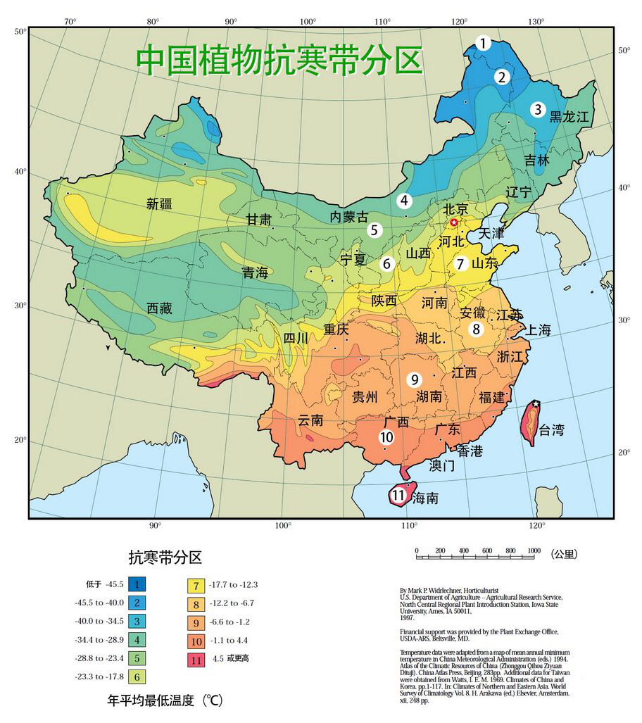原品種作為雞爪槭的變種,可適應(yīng)最低-20℃的低溫,種植范圍廣,北至京津冀,南至湖北、四川、貴州等地(如圖7區(qū)﹣9區(qū))。其冬季雖然落葉,但枝條亦能呈現(xiàn)紅色,所以,金禧非常適合在黃河以北,例如說北京,作為城市色塊產(chǎn)品的補充,為北方單調(diào)的色塊增彩添色。